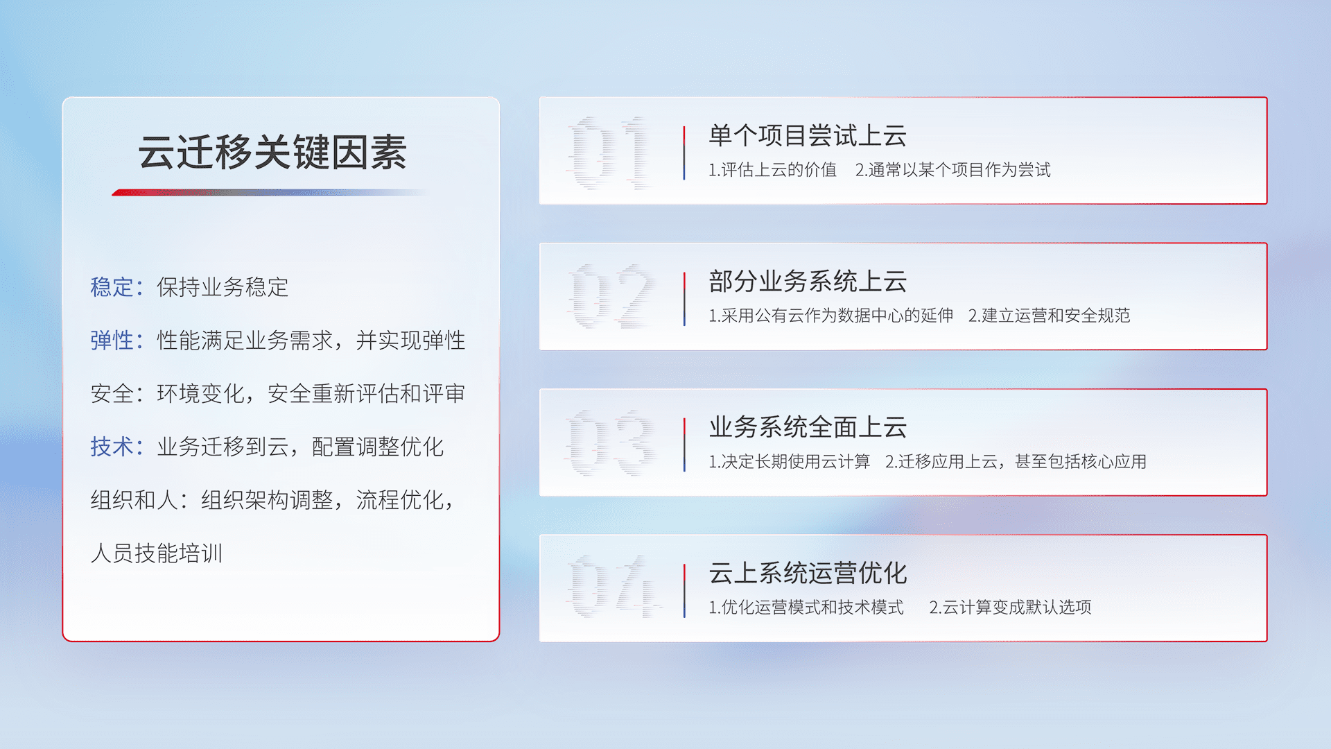结合实际业务,,从规划设计、、云平台选型、、、、云原生改造、、、、数据迁移、、、集成交付,,,迁移全过程为客户识别最佳上云路径,,做好风险识别管理,,设计网络架构、、、、身份权限、、、安全审计合规、、、、操作审计、、日志审计、、、监控告警策略、、、多站点容灾设计等,,,对云上基础设施进行整体规划,,提升IT治理水平,,,,以满足弹性、、、高可用、、、高性能的需求。。。