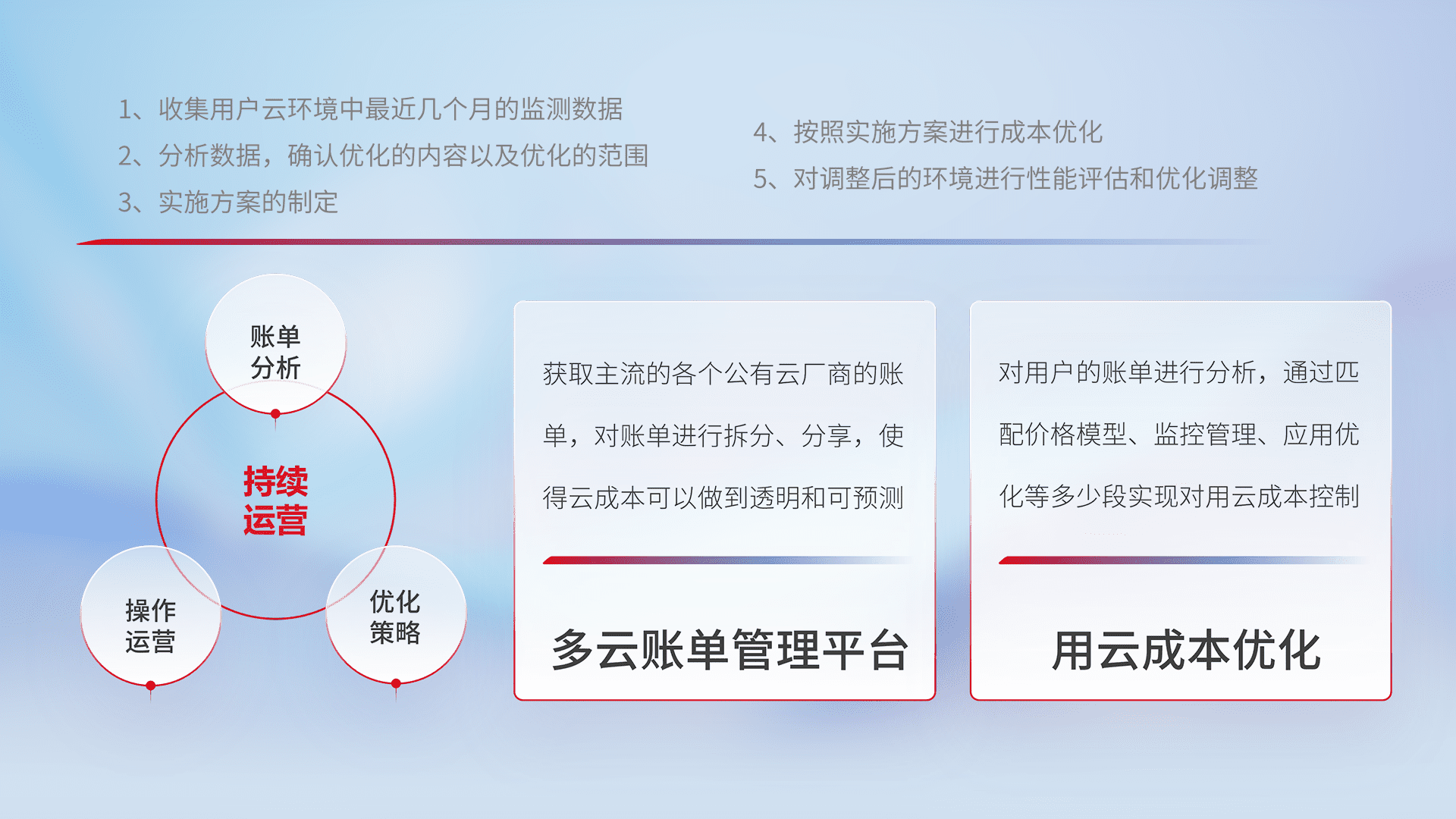 通过多云纳管,,,,以统一的资源数据模型把客户的云资源进行抽象和封装,,,进而实现对多云资源的统一操作,,,,保障云资源管理的可靠性、、稳定性与可用性。。。量身定制化运维内容,,,,配置、、开发运维、、补丁管理、、备份、、、监控、、、、认证和访问管理、、、审计和日常巡检等,,,保障在用云过程中的可靠度,,,,稳定度以及高可用率。。。。