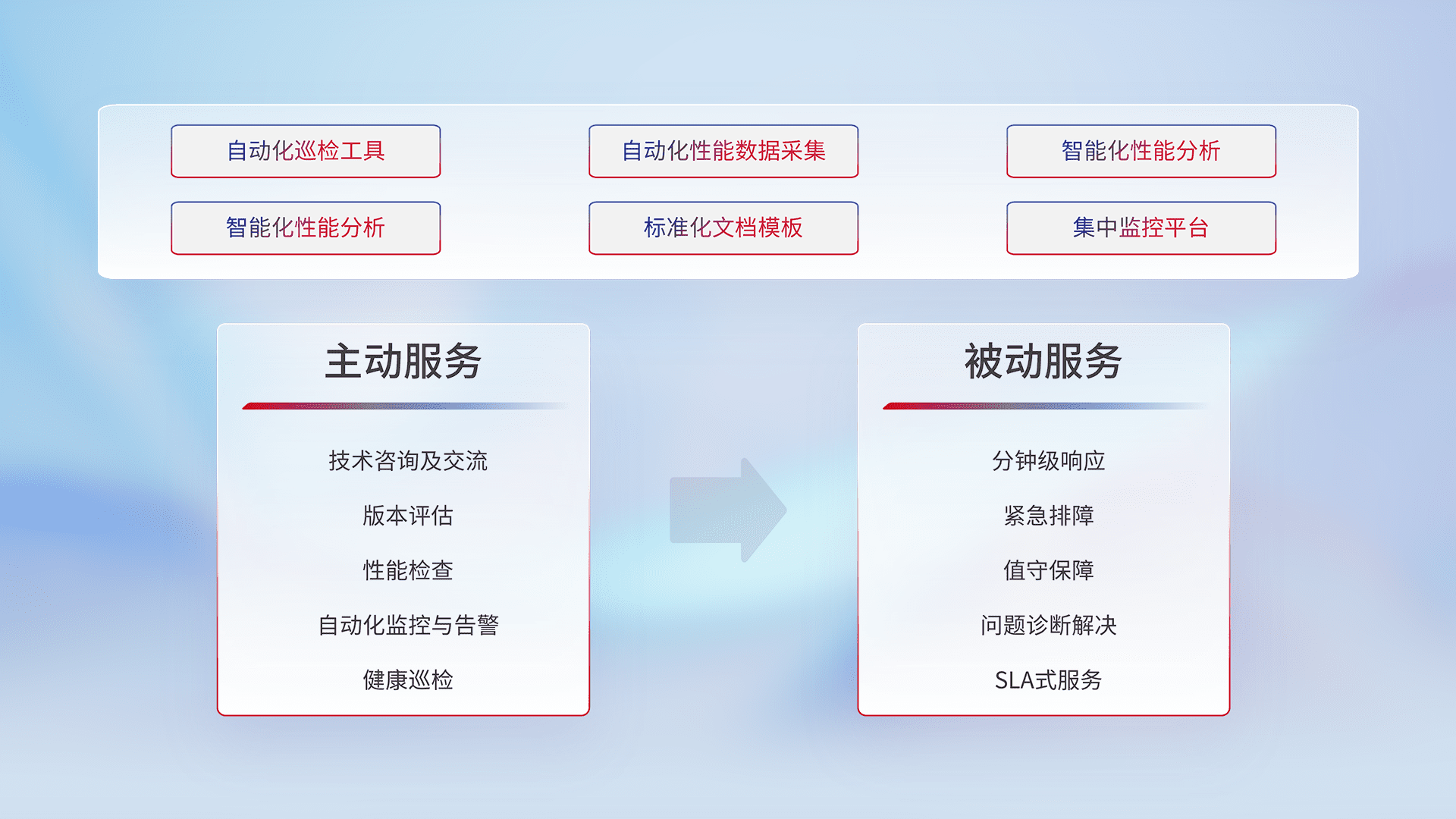 智能化工具和标准化文档,,,保障服务质量,,提供主动服务(包含技术咨询、、版本评估、、性能检查、、、、自动化监控与告警、、健康巡检)和被动服务包含(分钟级响应、、、、紧急排障、、、、值守保障、、问题诊断解决、、SLA服务)。。。。